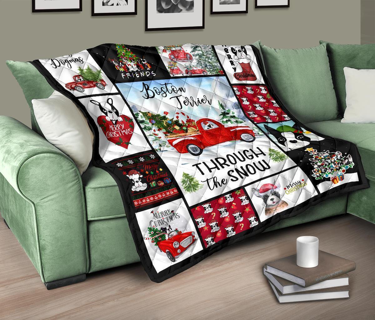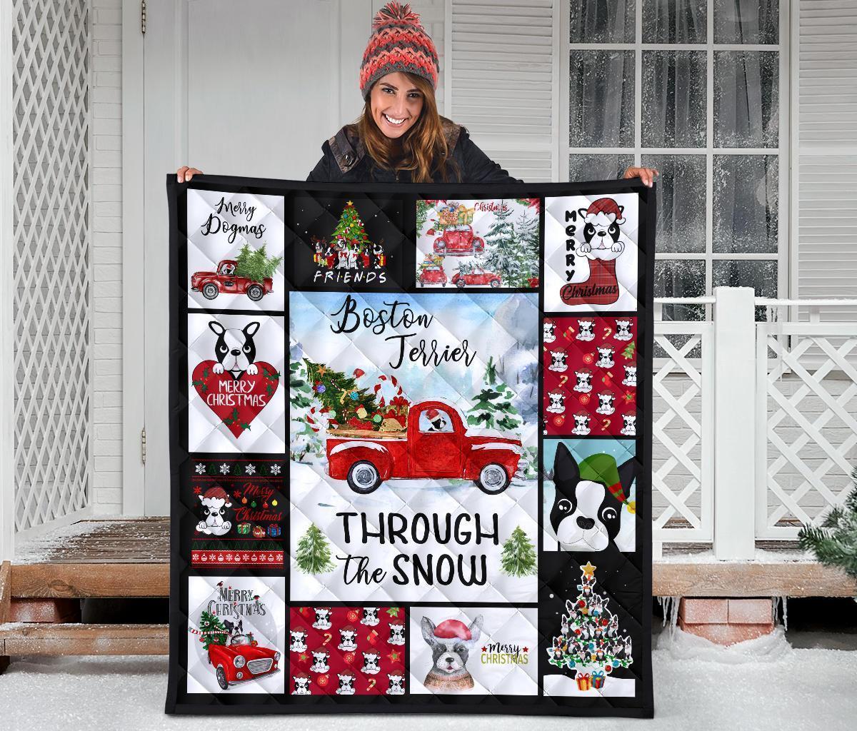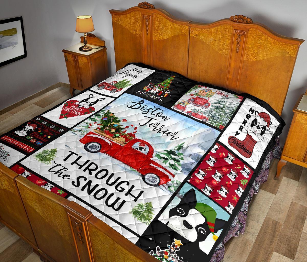 Through The Snow Boston Terrier Quilt Blanket Xmas